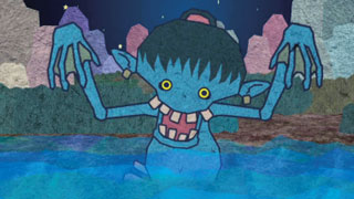 体は緑か青でヌルヌル。萌黄色の瞳で水面に顔を出します。時に牛や馬をも水中に引きずりこむことがあるといいます。人間と友達になりたがり、裏切ると尻の穴が抜かれるという言い伝えがあります。