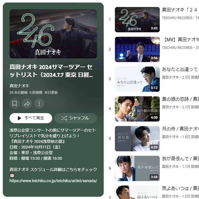 2024年10月11日、浅草公会堂にて行われたライブ「真田ナオキ 2024浅草秋の宴」のセットリストをYouTubeプレイリストで公開。(一部未配信曲を除く)